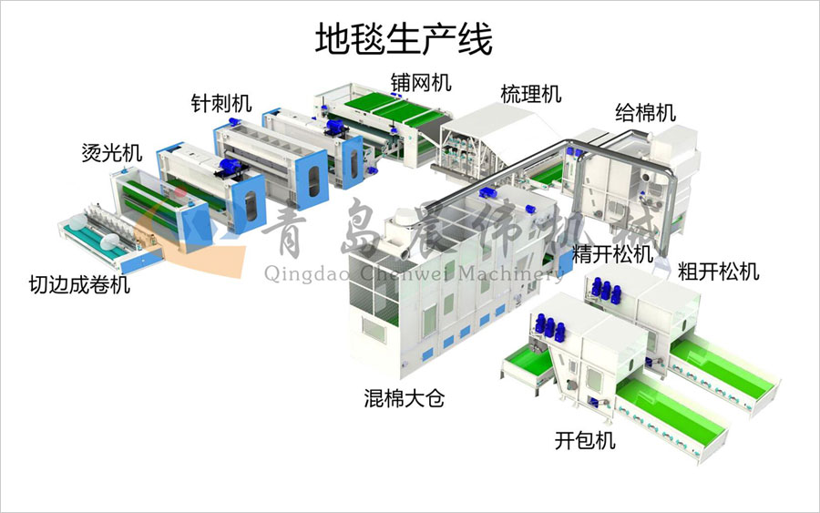 開(kāi)包機(jī)-開(kāi)松機(jī)-振動(dòng)給棉機(jī)-梳理機(jī)-鋪網(wǎng)機(jī)-針刺機(jī)-切邊成卷機(jī)
