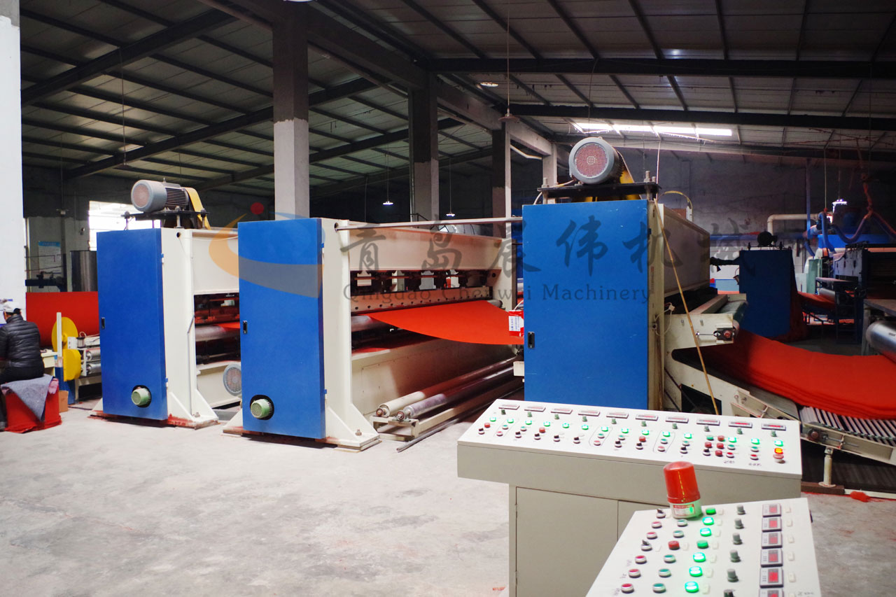 5. CWPW-鋪網(wǎng)機(jī):用于將梳理纖網(wǎng)通過(guò)移動(dòng)小車交叉折疊為所需幅寬和定量的多層纖網(wǎng),以供后道工序使用。鋪網(wǎng)輥采用特殊結(jié)構(gòu),加裝壓網(wǎng)輥和導(dǎo)流板,不飄網(wǎng)不起皺,五只大功率電機(jī)精確控制各部件的運(yùn)動(dòng),電動(dòng)輸出簾高度調(diào)節(jié)裝置