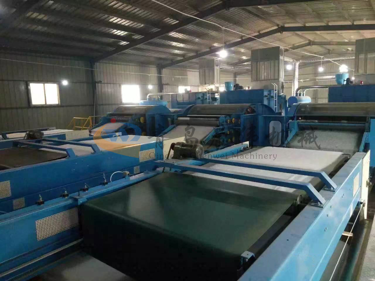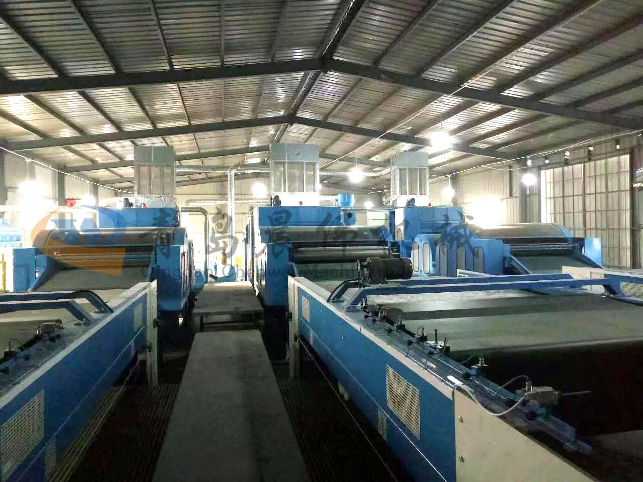 開(kāi)包機(jī)-開(kāi)松機(jī)-振動(dòng)給棉機(jī)-梳理機(jī)-鋪網(wǎng)機(jī)-烘房-燙光機(jī)-成卷切片機(jī)