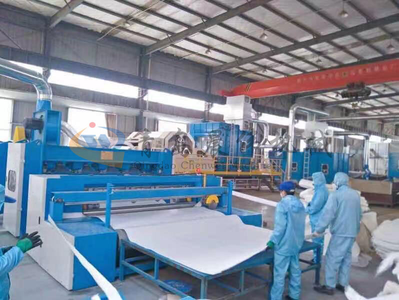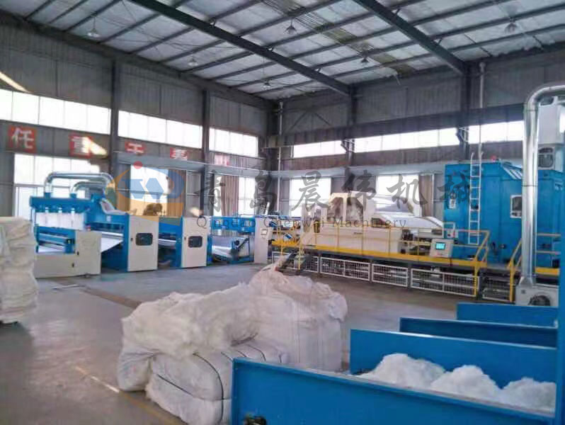 開包機(jī)-開松機(jī)-振動(dòng)給棉機(jī)-梳理機(jī)-鋪網(wǎng)機(jī)-針刺機(jī)-成卷切片機(jī)
