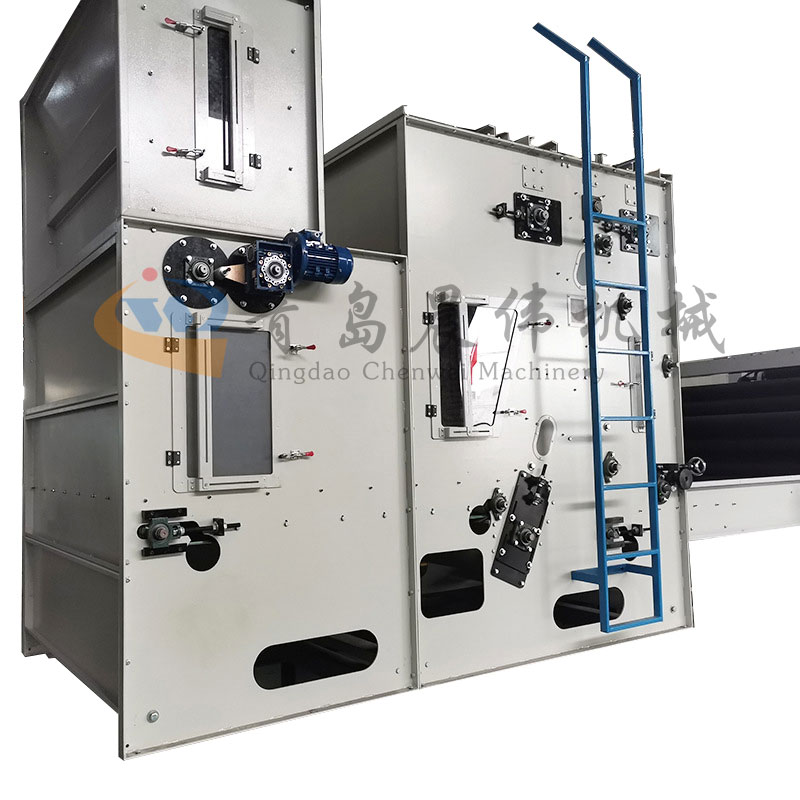 震動式給棉機主要式將經(jīng)過初步開松的纖維集中收集在棉倉中,并且鋪成相對均勻,等厚,等寬的纖維棉層輸送到梳理機。